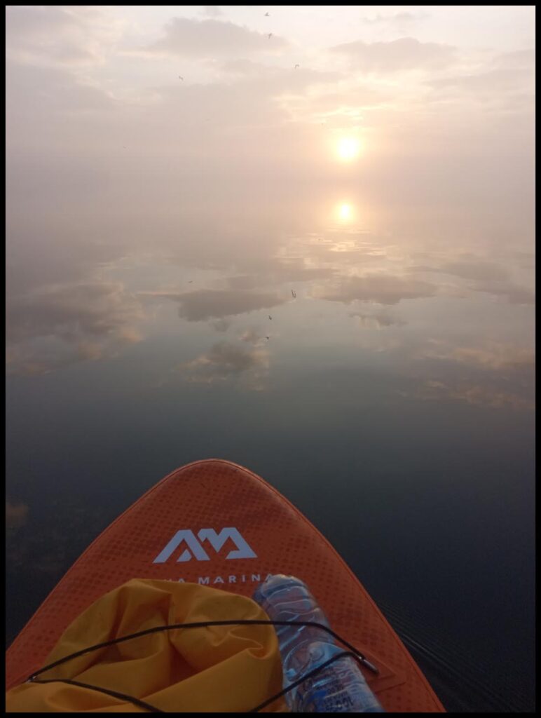 Ja jednak mam pecha (możliwe, że jest to też taka pora roku). Kolejny raz wybrałem się na SUPa, wstając z samego rana, a po przybyciu na miejsce – mgła. Tylko, że nie taka jak w poprzednim wpisie (tym właśnie – https://scoutshout.pl/2022/11/30/supem-w-mgle/), delikatnie zamglony akwen. Nie, tym razem mgła była taka, że ledwo było widać koniec wiosła (przesadzam, ale tylko trochę). Wystartowałem z mojej ulubionej miejscówki na Pogorii IV, skąd zawsze były ładne widoki. Nie tym razem, tym razem nie było nawet widać wysp znajdujących się jakieś pięćset metrów dalej. Nie warto nawet wspominać o przeciwległym brzegu.